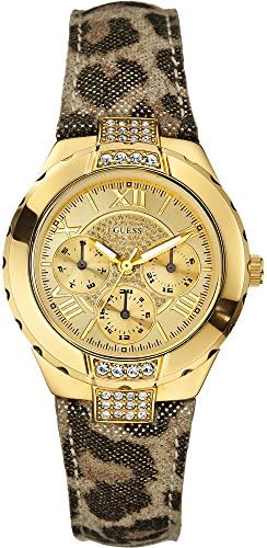 This Guess Time to Give ladies watch has a stylish gold coloured dial with a day/date display and a 24hr sub dial and gold coloured Roman numeral markers. The watch is set in a polished gold PVD stainless steel case with stones and a sparkle leopard print leather strap.