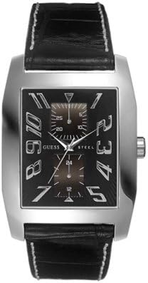 Guess gents multifunction watch Polished steel rectangle case Sunray black dial with 2 eye multifunction detail Imitation croco black leather strap