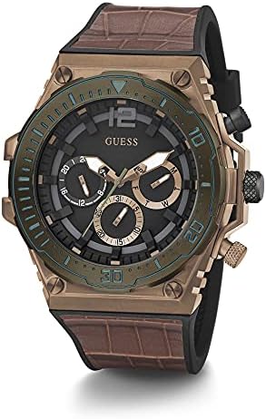 Brown silicone-backed leather straps that create a flex feel Coffee colored case with a pop of green accents along the bezel Multi-function black dial with coffee acents 48MM stainless steel case with mineral glass crystal Water resistant to 50 meters (165 feet): In general, suitable for short periods of recreational swimming, but not diving or snorkeling