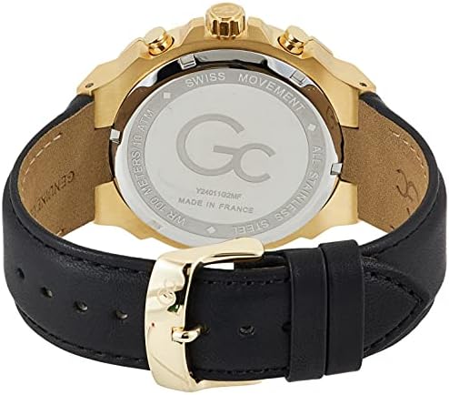 This Guess Collection Y24011G2MF Cableforce oriented watch for men, has a gold-plated steel case with circular shape. The strap is black leather , black dial color and gold hands. The crystal is mineral, quartz movement and analog display. Functions: Chronometer, 3 hands and calendar. Water resistance: 10 Atm. Diameter: 44 mm.