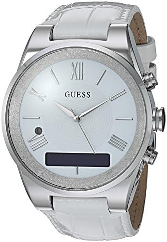 Brand Name GUESS Model number C0002MC1 Part Number C0002MC1 Item Shape Tonneau Dial window material type Mineral Clasp Buckle Case material Stainless Steel Case diameter 43 millimetres Case Thickness 16 millimetres Band Material Leather Band width 25 millimetres Band Color silver,white Dial color White Special features Water Resistant Item weight 68 g Movement Quartz Display Type Analogue