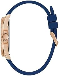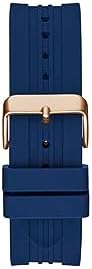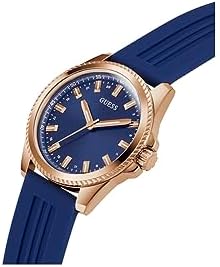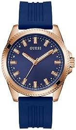 Manufacturer: GUESS Model number: GW0639G3. Dial: analogue, colour: blue. Case: stainless steel case rose gold. Diameter: approx. 44.0 mm (without crown), height approx. 9.9 mm. Case back: stainless steel with manufacturer's logo. Strap: silicone strap blue. Width: approx. 2.2 cm. Length of the watch: approx. 19.0 cm. Pin buckle. Waterproof: 5 ATM (50 m). Functions / displays: Quartz movement. Hardened mineral glass. Hours, minutes, seconds display. Box contents: delivered in GUESS packaging