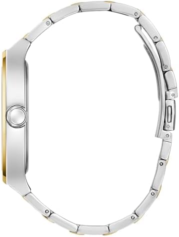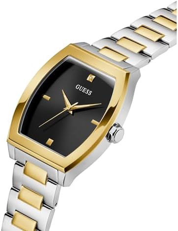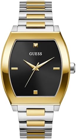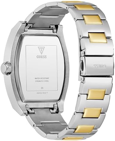 Manufacturer: GUESS Model number: GW0847G1. Dial: analogue, colour: black. Case: stainless steel case silver, bezel gold. Diameter: approx. 42.0 mm (without crown), height approx. 8.8 mm. Case back: stainless steel with manufacturer's logo. Bracelet: two-tone stainless steel bracelet. Width: approx. 2.2 cm. Length of the watch: approx. 21.0 cm. Folding clasp. Waterproof: waterproof 3 ATM (30 m). Functions / displays: Quartz movement. Hardened mineral glass. Hours, minutes, seconds display. Box contents: delivered in GUESS packaging