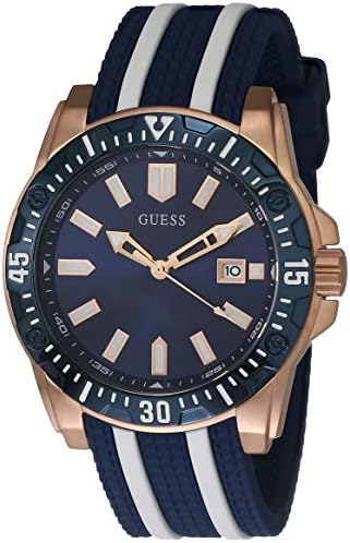 Quartz drive. Analogue display. Water resistant to 5 bar. Date functions day dial colour: blue. Case Color: Rose Gold Band Color: Blue, White Case Material: Stainless Steel Band Material: Silicone Case Diameter(Excluding Crown): 46mm Case details IP coated. Glass mineral glass. Clasp bracelet pin buckle.