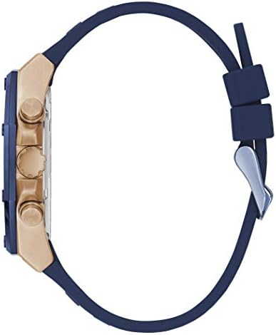 Blue smooth silicone strap with buckle closure A blue chrono-look multi-function dial The case features 8 screw details on the bezel 44MM stainless steel case with mineral glass crystal Water resistant to 50 meters (165 feet): In general, suitable for short periods of recreational swimming, but not diving or snorkeling