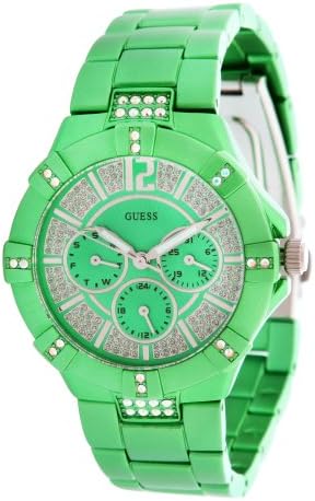 This Guess Vista ladies watch from The Collection has a round green brushed aluminium watch colour and The stone set dial features day, date and hand dials sub 24 hours.