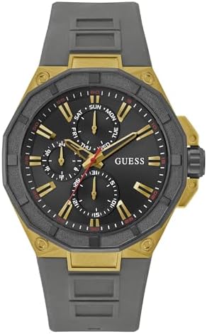 Guess is one of the leading fashion brands worldwide, known for its iconic style and innovative design. Since its inception, Guess has enjoyed great popularity and has become a symbol of fashionable luxury. Whether traditional, modern, classic or sporty, Guess watches offer you all the possibilities to find a watch for you. Item description: - Guess men's watch R2 silicone. - Case diameter: approx. 46 mm (without crown). - Case height: approx. 11.5 mm. - Stainless steel case/shape of the housing: round. - Display: hour, minute and second, date. - Hardened flat mineral glass. - Water resistant (5 bar test pressure according to DIN standard 8310). - High-quality quartz movement. - Silicone strap with pin buckle. - Strap width: 28 mm. - Strap length: men's standard. Box contents: - Guess men's watch R2 silicone. - Guess gift box