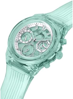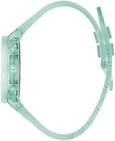 Transparent turquoise 23mm Silicone strap fits up to 7.5-inch wrist circumference Turquoise clear dial reveals internal mechanism; turquoise hands & white accents; full markers Turquoise 39mm polycarbonate case with mineral glass crystal; polycarbonate top ring Multifunction subdials display day, date & 24-hours Water resistant to 30m (100ft): in general, withstands splashes or brief immersion in water, but not suitable for swimming or bathing