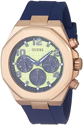 Blue Stainless Steel Case: This stylish watch features a 46mm round case made of blue stainless steel for durability Lime Green Dial: The bold lime green dial has a modern design with rose gold tone hands and hour markers Two-Piece Silicone Strap: It comes with a comfortable two-piece silicone strap that adjusts to fit most wrist sizes Quartz Movement: The watch uses a precise quartz movement for accurate timekeeping 8 inch blue strap