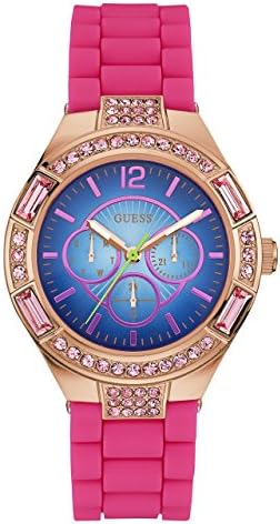 Brand Name GUESS Model number W0777L1_Rose Gold Tone Part Number W0777L1_Rose Gold Tone Item Shape Round Dial window material type Mineral Glass Case diameter 39 millimetres Band width 21 millimetres Band Color Pink Dial color Blue Item weight 227 g Display Type Analog