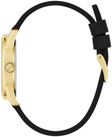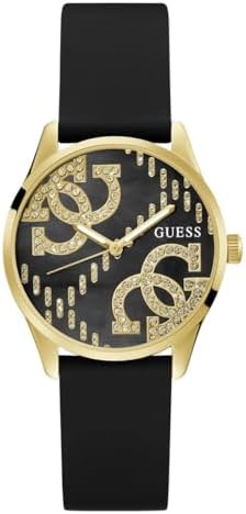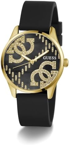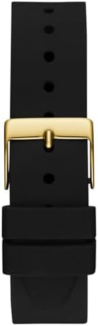 Manufacturer: Guess Model number: GW0755L3. Dial: analogue, colour: black with white stones. Case: stainless steel case, gold-coloured. Diameter: approx. 36.0 mm (without crown), height approx. 9.15mm Case back: stainless steel with manufacturer's logo. Strap: black silicone strap. Width: approx. 1.8 cm. Length of the watch: approx. 19.0 cm. Pin buckle. Waterproof: waterproof 3 ATM (30 m). Functions / displays: Quartz movement. Hardened mineral glass. Hours, minutes, seconds display. Box contents: delivered in Guess packaging