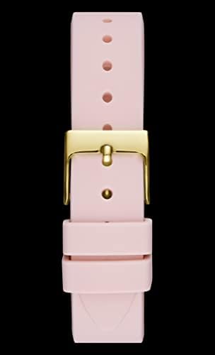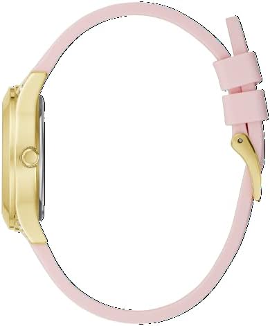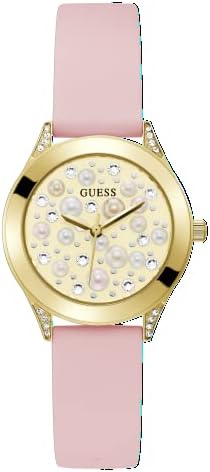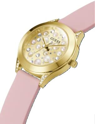 Adjustable pink 16mm silicone strap fits up to 7.5-inch wrist circumference Gold-tone dial with scattered crystal & pearl pattern; gold-tone hands Gold-tone 36mm stainless steel case with crystal accents on lugs Mineral glass crystal Water resistant to 30m (100ft): in general, withstands splashes or brief immersion in water, but not suitable for swimming or bathing