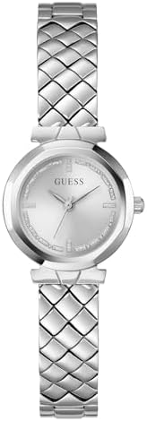 Manufacturer: GUESS Model number: GW0839L4. Dial: analogue, colour: silver with stones. Casing: Stainless steel case silver-coloured, bezel silver Diameter: approx. 26 mm (without crown), height approx. 7.7 mm. Case back: stainless steel with manufacturer's logo. Bracelet: stainless steel bracelet, silver. Width: approx. 1.2 cm. Length of the watch: approx. 19.0 cm. Folding clasp. Waterproof: waterproof 3 ATM (30 m). Functions / displays: quartz movement, Hardened mineral glass. Hours, minutes, seconds display. Box contents: delivered in GUESS packaging