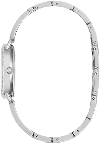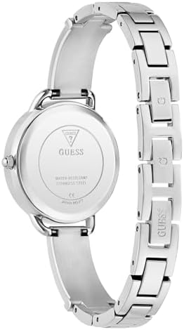 Manufacturer: GUESS Model number: GW0914L1. Dial: analogue, colour: silver with stones. Casing: Stainless steel case silver-coloured, silver bezel set with stones. Diameter: approx. 30 mm (without crown), height approx. 8.7 mm. Case back: stainless steel with manufacturer's logo. Bracelet: stainless steel bracelet silver studded with stones. Width: approx. 1.0 cm. Length of the watch: approx. 19.0 cm. Flap closure. Waterproof: waterproof 3 ATM (30 m). Functions / displays: quartz movement, Hardened mineral glass. Hours, minutes, seconds display. Box contents: delivered in GUESS packaging