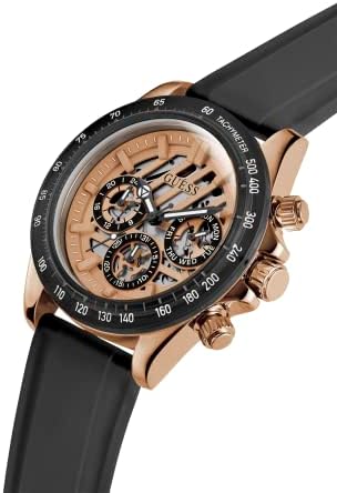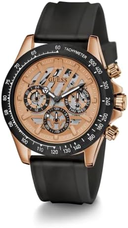 44mm Two-Tone Stainless Steel + Sustainable Nylon Case Sunray Black Cut Through Multifunction Dial Black Textured PolyurethaneStrap Quartz Analog Multi-function Water resisistant to 50 meters.8 inch strap
