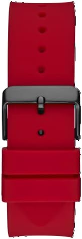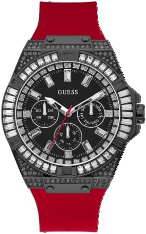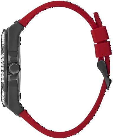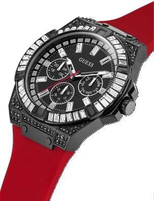 Adjustable red 24mm silicone strap fits up to 7.75-inch wrist circumference Black dial with crystal markers Black 47mm stainless steel case with crystal embellishments; mineral glass crystal Multifunction subdials display day, date & 24-hours Water resistant to 50m (165 ft): In general, suitable for short periods of recreational swimming, but not diving or snorkeling