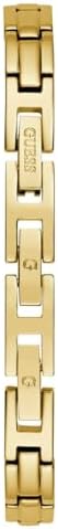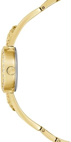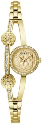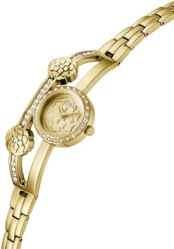 Guess Chloe Analog Watch features a classic design that seamlessly blends style and functionality, making it versatile for various occasions. This unique jewelry style gives the look of a bracelet and a watch on the wrist with a split bangle featuring peony flowers as a nod to the iconic Guess Peony G logo. Self-adjustable g-links make this bracelet easy to size, great to wear on its own or layer with other jewelry. Its comfortable fit ensures all-day wear, while the carefully finished watch case and stylish strap add an elegant touch. Built to be relatively strong and durable, this watch is perfect for comfortably wearing it for any and every occasion. Comes in 20.5 mm diameter size and gold tone/champagne color.