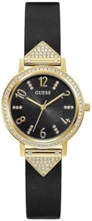 GUESS Women's Time Only Watch from the Trilux Collection.Watch with water resistance up to 30m. The dial is black with Sunray finish. The case is 32 mm in gold colour with a polished finish made of stainless steel with crystals. The strap is black with smooth finish and made of leather. The clasp is pin buckle. Movement: Quartz. Display: Analogue. Reference is GW0473L2