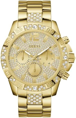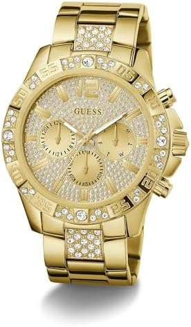 This Guess GW0796G2 Majestic steel oriented men's watch has a circular gold stainless steel case. The chain is gold stainless steel , gold dial color, gold stainless steel bezel with crystals, fluorescent gold stainless steel handsand gold stainless steel indexes. The crystal is mineral glass, quartz movement and analog display. Functions: Multifunction and three hands. Water resistance: 5 ATM. Diameter: 48 mm. Clasp type: Deployant. Enjoy your Guess watch.