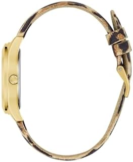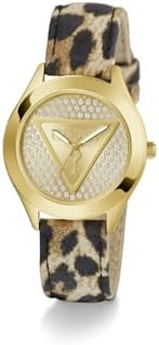 Manufacturer: Guess Model number: GW0745L2. Dial: analogue, colour: gold, decorated with stones. Case: stainless steel case, gold-coloured. Diameter: approx. 34.0 mm (without crown), height approx. 9.85mm Case back: stainless steel with manufacturer's logo. Bracelet: leather bracelet multi-coloured (leopard). Width: approx. 1.6 cm. Length of the watch: approx. 19.0 cm. Pin buckle. Waterproof: waterproof 3 ATM (30 m). Functions / displays: quartz movement, Hardened mineral glass. Hours, minutes, seconds display. Box contents: delivered in Guess packaging