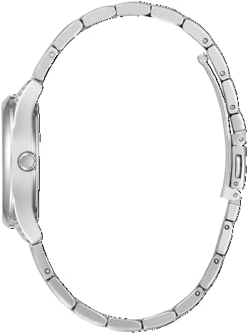 Silver-tone 31mm stainless steel 316L bracelet fits up to 7.48-inch wrist circumference Silver dial with crystal markers & silver-tone hands Day window at 12 o'clock; date window at 3 o'clock Silver-tone stainless steel case; mineral glass crystal Water resistant to 30m (100ft): in general, withstands splashes or brief immersion in water, but not suitable for swimming or bathing