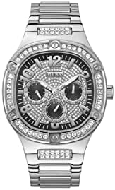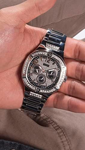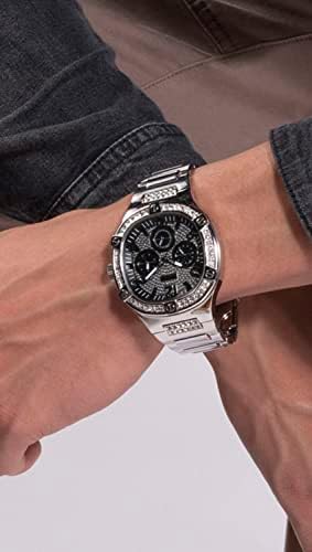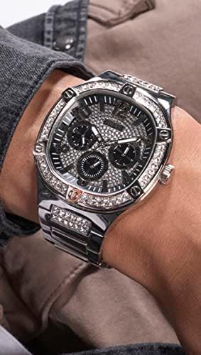 Silver Tone Strap: The watch features an 8 inch silver tone strap for a stylish look Silver Tone Case: The 46mm case is crafted from stainless steel with a sleek silver tone finish Black Dial: The dial has a bold black color with crystal detailing for a modern aesthetic Quartz Movement: The watch is powered by a quartz movement for precise timekeeping Water Resistant: With a water resistance level of 100 meters, this watch can withstand splashes and brief immersion in water