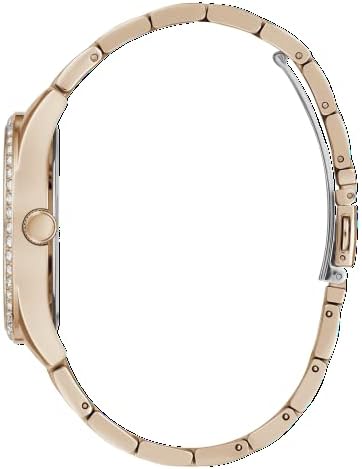 Rose gold-tone 20mm stainless steel bracelet fits up to 7.5-inch wrist circumference White sunray dial with crystal markers & rose gold-tone hands Heart-shaped cut-thru at 6 o'clock with sweep second hand Rose gold-tone 38mm stainless steel case with crystal embellishments; mineral glass crystal Water resistant to 50m (165 ft): In general, suitable for short periods of recreational swimming, but not diving or snorkeling
