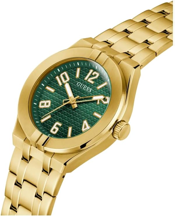 Men's watch from Guess, model ESCAPE Stainless steel case gold with mineral glass, case diameter: approx. 44.0 mm (without crown), case height: approx. 10.1 mm Stainless steel bracelet gold-coloured, folding clasp Green dial, hours - minutes - seconds display The watch comes in a beautiful gift box