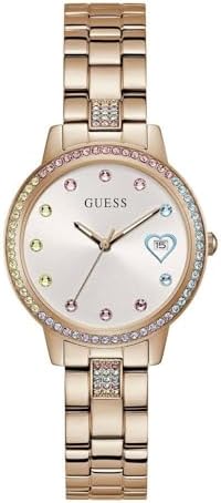 Women's watch from Guess with date display, model THREE OF HEARTS Stainless steel case rose gold with mineral glass, case diameter: approx. 34.0 mm (without crown), case height: approx. 7.9 mm, bezel set with stones Stainless steel bracelet rose gold studded with stones, folding clasp Silver dial with colourful stones The watch comes in a beautiful gift box -- -- -- Additional information -- -- -- -- -- Country of origin -- -- -- -- -- -- -- China