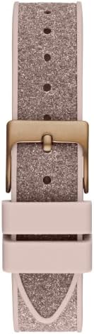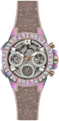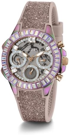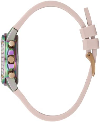 Nude 16mm FLEX strap with glitter leather backed by silicone fits up to 7.5-inch wrist circumference Clear dial adorned with baguette crystals; partial markers; rose gold-tone hands Iridesent violet 36mm stainless steel case with mineral glass crystal; baguette crystal-encrusted top ring Multifunction subdials display day, date & 24-hours Water resistant to 50 meters (165 feet): In general, suitable for short periods of recreational swimming, but not diving or snorkeling