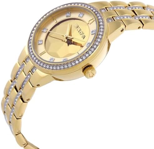 A truly captivating masterpiece, this Bulova ladies’ timepiece from the Crystal collection has an ingeniously beautiful dial that is sure to dazzle. Embellished with 112 crystals, the gold-tone stainless steel case and bracelet deliver a stunningly luxurious wrist presence, with a flat mineral crystal offering an uninterrupted view of the magnificent dial. The champagne dial features a faceted motif, with gold-tone accents and hands and 8 sparkling crystal hour markers. The matching gold-tone stainless steel bracelet features a slim foldover closure that maintains the timepiece’s sleek silhouette. Glisten at every angle with this elegant Bulova ladies’ timepiece.