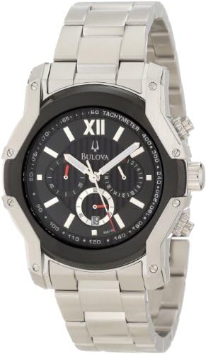 Bulova Wintermoor Chronograph stainless steel Men's watch Model# 98B149 will make a statement! This watch features a stainless steel case & bracelet, beautiful black dial with textured center set with silver tone & luminous hand indicators, silver tone index hour markers, Seconds Hand, Tachymeter Scale, Chronograph Functions: 60 second, 60 minute, Date display at the 6 o'clock position, 8 Screws on bezel, and military time subdials, Mineral crystal, Quartz Chronograph movement, Water resistant to 30 meters / 100 feet.