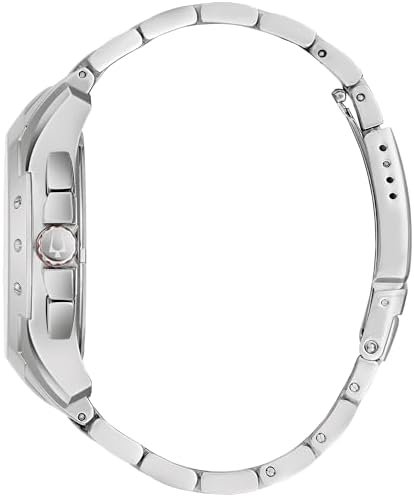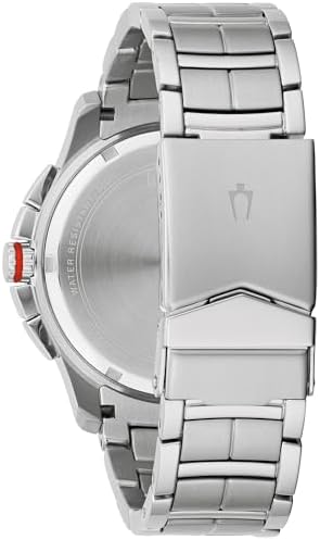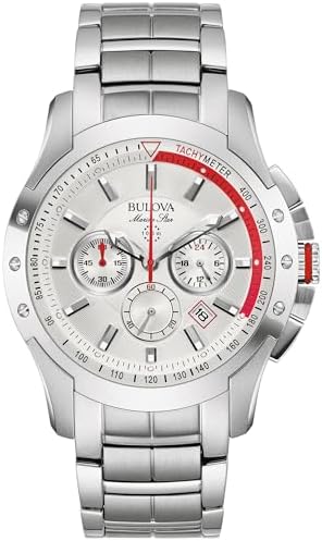 Adventures await you on land and sea with this sea-inspired men's performance watch from the Bulova Marine Star collection. This contemporary stainless steel watch features a six-hand chronograph with calendar, set atop a silver white dial, and is accented with a touch of crimson for added appeal. The screw case back ensures water resistance up to 100 meters, and the folding buckle of the bracelet with safety clasp brings extra security to your water adventures. Modern style and advanced performance come together in this sporty yet refined men's watch.