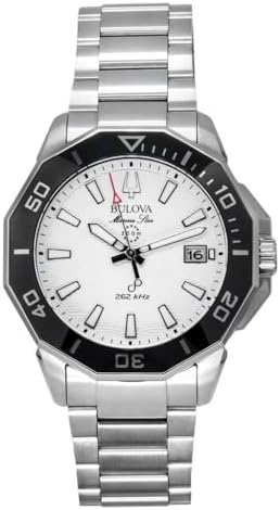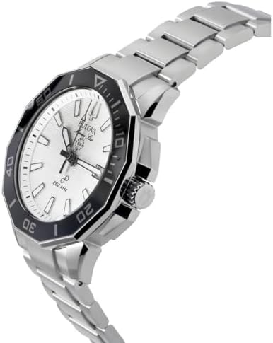 Silver-tone stainless steel case and bracelet. Uni-directional rotating black ceramic bezel. White dial with silver-tone hands and index hour markers. Minute markers around the outer rim. Dial Type: Analog. Luminescent hands and markers. Date display at the 3 o'clock position. Quartz movement. Scratch resistant sapphire crystal. Screw down crown. Solid case back. Round case shape, case size: 43 mm. Band width: 22 mm. Fold over clasp with a safety release. Water resistant at 200 meters / 660 feet. Functions: date, hour, minute, second. Marine Star Series. Sport watch style. Bulova Marine Star HPQ Precisionist Quartz White Dial Men's Watch 96B426.