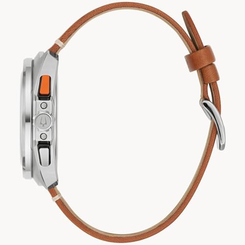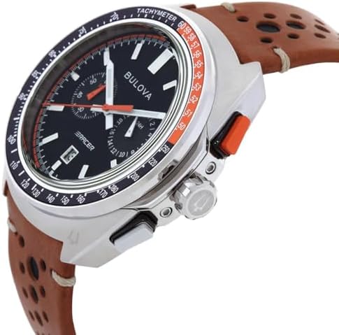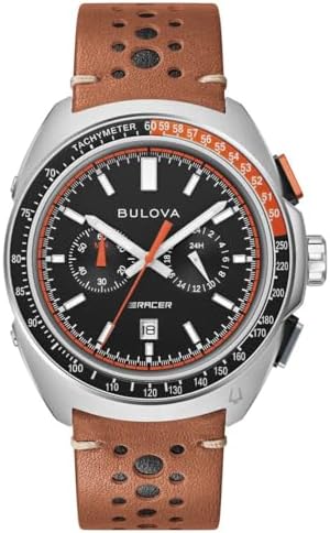 Built on Bulova’s vibrant history in motorsport – from soap box derbies to the upper echelons of auto racing – the new men’s Racer chronograph watch is fine-tuned and designed for performance. The contoured silver-tone stainless steel case features a unique design evoking the aerodynamic curves of the world’s fastest automobiles. A two-tone orange and black tachymeter ring offers further functionality, while pronounced pushers provide a distinctively automotive aesthetic. The black 5-hand chronograph dial features an orange and white racing pattern chapter ring, with a date display at 6 o’clock and black subdials displaying the chronograph minutes and the 24-hour time. A bold orange chronograph seconds hand ensures optimal legibility no matter the speed. The dial is appointed with applied silver-tone markers and matching beveled hands, all filled with a super-luminous material for low-light visibility. The watch is paired with a perforated brown leather racing-style strap with a pin b