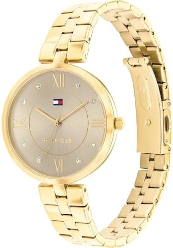 Tommy hilfiger womens watch. Gold stainless steel case Pink dial. Quartz movement. Fold-over Clasp closure. Water resistance of 30 meters.