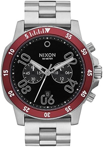 Perfect colours to suit anyone's taste features a second track on the concave ring, printed hours numbers with custom moulded hands, chronograph and date function for an effective design. Manufactured with a Japanese quartz movement, all of this is under mineral crystal case that is water resistant up to 10ATM, making it perfect to go swimming with. Its strap is a free swing 3 link that has a width of 2.4cm with a locking clasp micro adjust fastening, making it easy to put on and remove, but secure at all times when wearing. 4.4cm(Diamater) Stainless Steel Complete in NIXON presentation box.