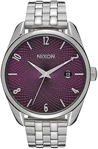 Nixon womens watch. Silver stainless steel case Purple dial. Japanese Quartz movement. Double Locking Fold-over Clasp closure. Water resistance of 50 meters.
