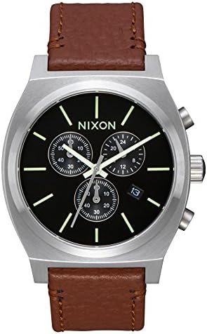 Nixon Time Teller Watch A11641037 man black This Nixon Men's Watch A11641037 is man-made, has a stainless steel case with a circular shape and a black color. The armis is brown leather, and the bezel is silver. Glass is mineral, quartz movement, and analog display. It belongs to the Time Teller collection and is manufactured in the USA. It can submerge up to 100 Meters. Among its functions, we can highlight the following: Hours, minutes and seconds, calendar, chronograph. Retro style