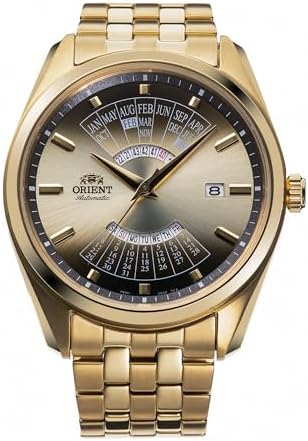 The best of both worlds. An exemplification of watchmaking quality and modern design, the watches from the Orient Contemporary collection offer elegance for special moments and versatility for everyday life. Featuring a one-of-a-kind display incorporating year, month, date and day, these models combine the functionality of mechanical watches with an original design that delights with a unique and distinctive touch. This new generation inherits the original Multi Year Calendar display system that shows the calendar for more than 20 years by matching the last 2 digits of years and months at 12 o'clock, and correspondence of the day and date at 6 o'clock. Men's casual watch with 43mm yellow gold stainless steel round case, mineral glass and clear caseback. Matching strap with folding clasp. Champagne Dial F6D22 mechanical movement with 22 jewels, manual and automatic winding. Analogue display with day, date, month and year calendar for precision and elegance. 5 ATM water resistant (not suitable for swimming)
