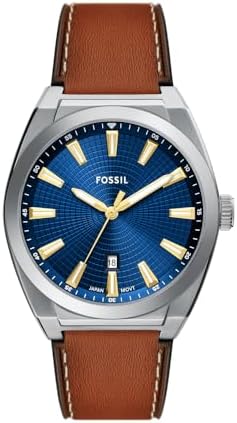 The Everett watch balances sporty and refined. Its bold blue sunray dial is housed in a 42mm round stainless steel case. Featuring a rich brown leather strap while the classic three-hand date movement keeps you on schedule. Wear it as a statement piece or dress it up—wherever your day takes you. Fossil leather products support responsible manufacturing via the Leather Working Group.