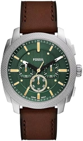 Inspired by classic American machinery, the Machine Chronograph commands attention with its bold knurled topring. Unmistakably masculine with a bold 44mm case housing a brushed green dial with textured details, all protected by a mineral crystal face. Powered by a precision quartz chronograph movement, this rugged timepiece is built to last with a rich brown leather strap. A true statement in industrial-inspired design.