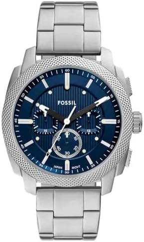 Inspired by classic American machinery, the Machine Chronograph commands attention with its bold knurled topring. Unmistakably masculine with a bold 44mm case housing a brushed blue dial with textured details, all protected by a mineral crystal face. Powered by a precision quartz chronograph movement, this rugged timepiece is built to last with a durable stainless steel bracelet. A true statement in industrial-inspired design.