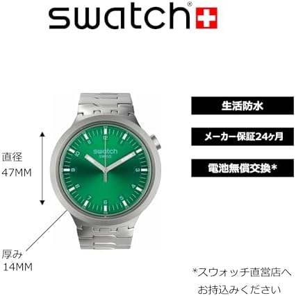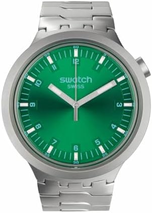 Brand Name Swatch Model number SB07S101G Part Number SB07S101G Item Shape Round Dial window material type Crystal Clasp Buckle Case material Stainless Steel Case diameter 47 millimetres Case Thickness 14 millimetres Band Material Metal Band width 4.7 centimetres Band Color Silver Dial color Green Calendar Date-Month Movement Quartz Display Type Analog-Digital