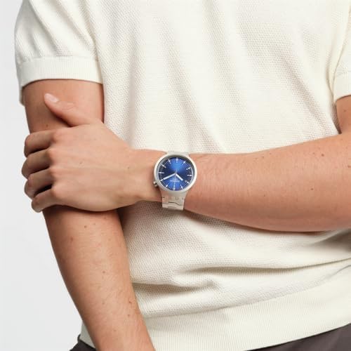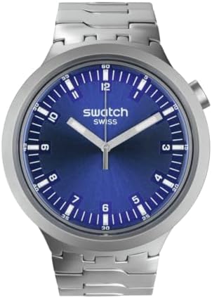 Featuring on this stainless steel oversize watch is a navy blue dial with sun-brushed finishing, white print and gray glow-in-the-dark hands. A stainless steel adjustable bracelet and sandblasted case and bezel finish off this navy blue big face watch.