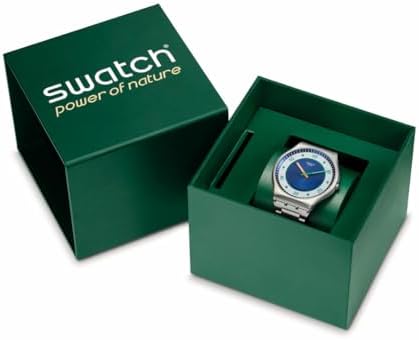 Cette montre Swatch Splash Dance en acier inoxydable ultra-fine possède un cadran bleu avec des chiffres arabes verts, des aiguilles verte et orange qui brillent dans le noir et un motif 3D innovant. They are boîtier de 42 mm en acier inoxydable brossé s'accompagne d'un bracelet ajustable assorti. Mouvement garanti 2 ans.