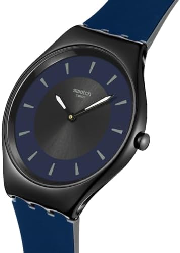 This ultra-thin watch has a black dial with sun-brushed finish. It features a dark blue printed outer ring and indexes stamped in grey. In addition, it features a black hour and minute hands that glow in the dark. The case and buckle are made of shiny stainless steel coated with black PVD. They are complemented by a matte dark blue strap with matte grey underside and a matte dark blue loop.