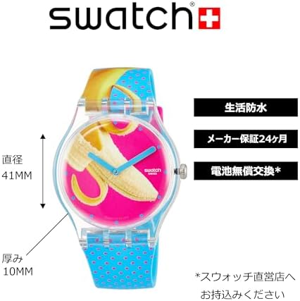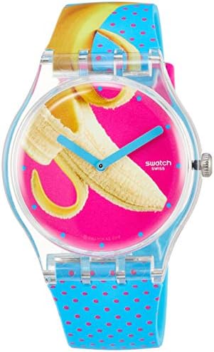 The wristwatch is made of transparent plastic housing and has a diameter of about 41 mm Analog wristwatch with a precise Quartz movement and a flat plastic glass. The water Resistance is 3 bar Provided with a 22 mm wide silicone strap in turquoise with pink Dots and a pin buckle The pink dial with a banana pattern and neon blue hands and punk markers peps up the everyday look Swiss made Unisex wristwatch from the collection "energy Boost"