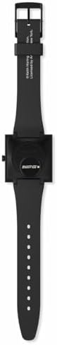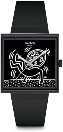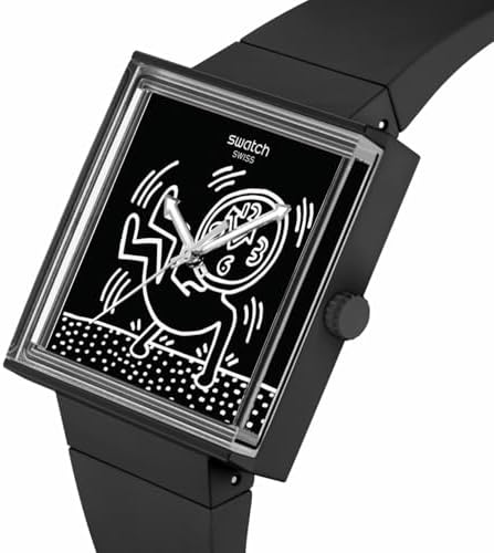The square, matte black BIOCERAMIC watch case features edge-to-edge biosourced glass that gives a side view of the white design printed on the dial. The square black dial has silver-colored, arrow-shaped hour and minute hands that glow in the dark and a silver-colored seconds hand. The dial and case are complemented by an integrated matte black biosourced strap with a matching biosourced loop and BIOCERAMIC buckle. The matte black battery cover with white print on the back depicts a Swatch logo that was drawn by Keith Haring.
