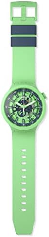 This BIG BOLD oversized watch features a solid matte green plastic case and silicone strap. The dial of this big face watch boasts multi-colored hands with white Swatch Glow.